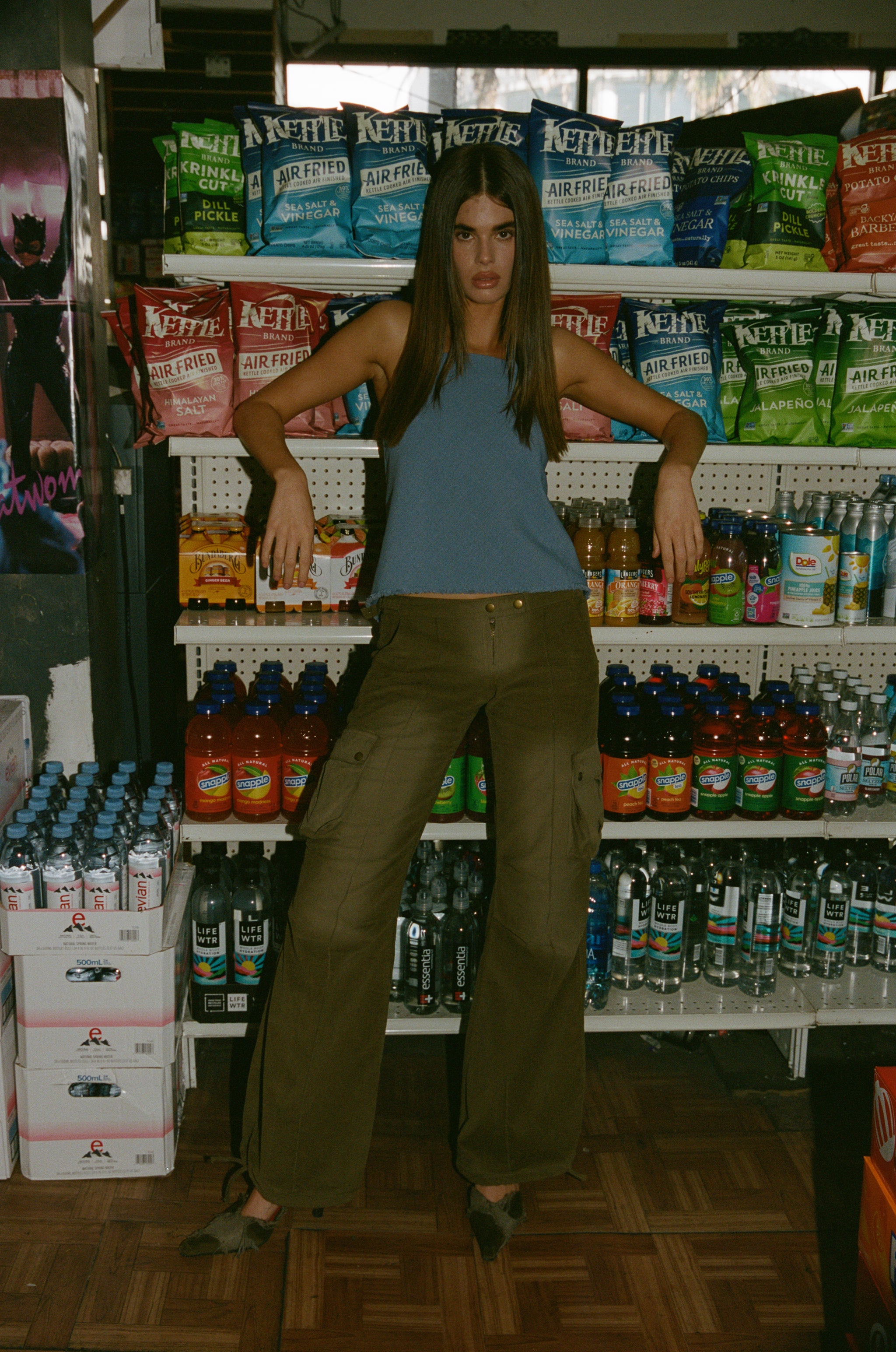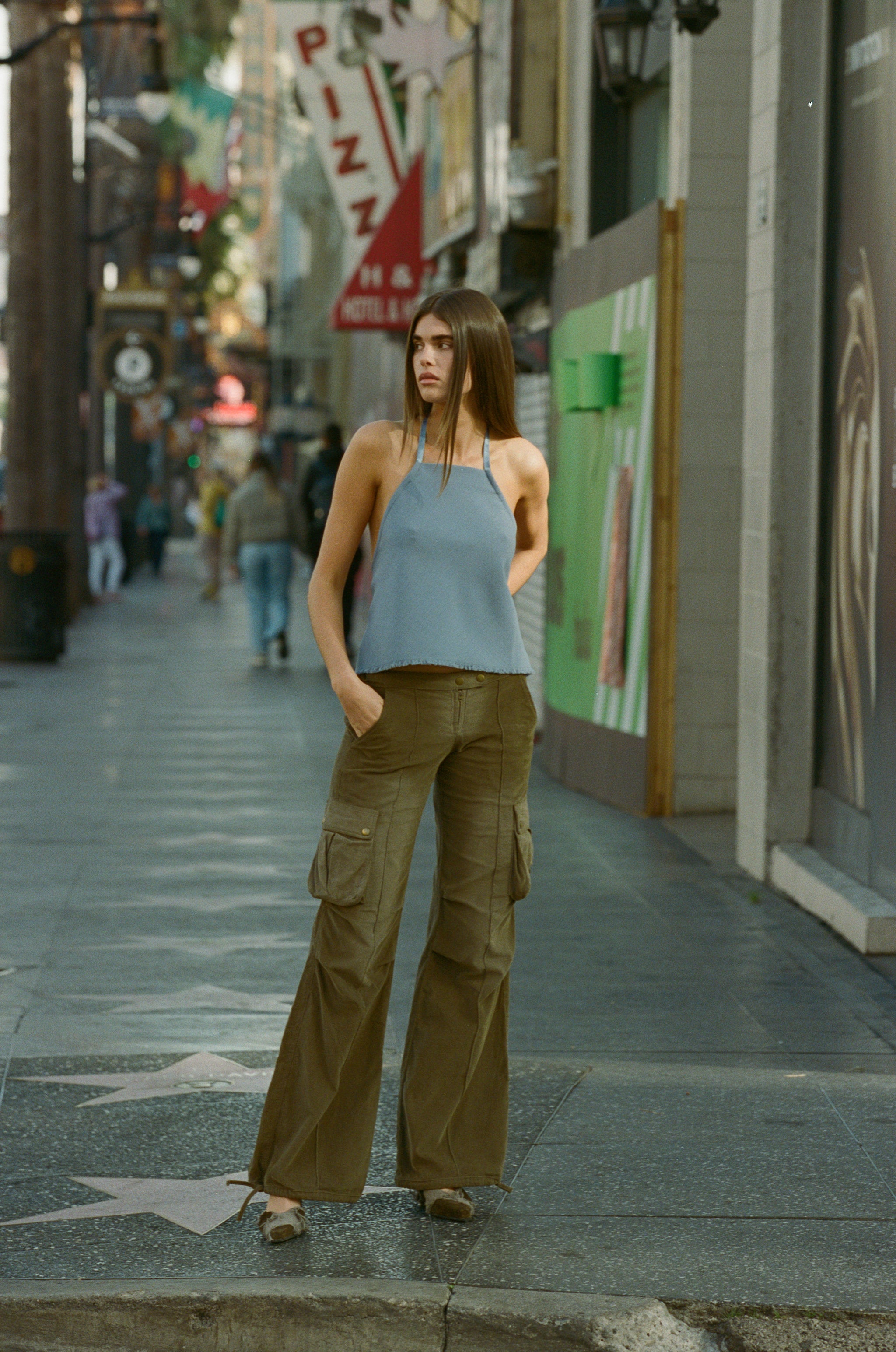 The Bridgette Pants are a low rise pant. featuring side pockets. and adjustable side buckles.