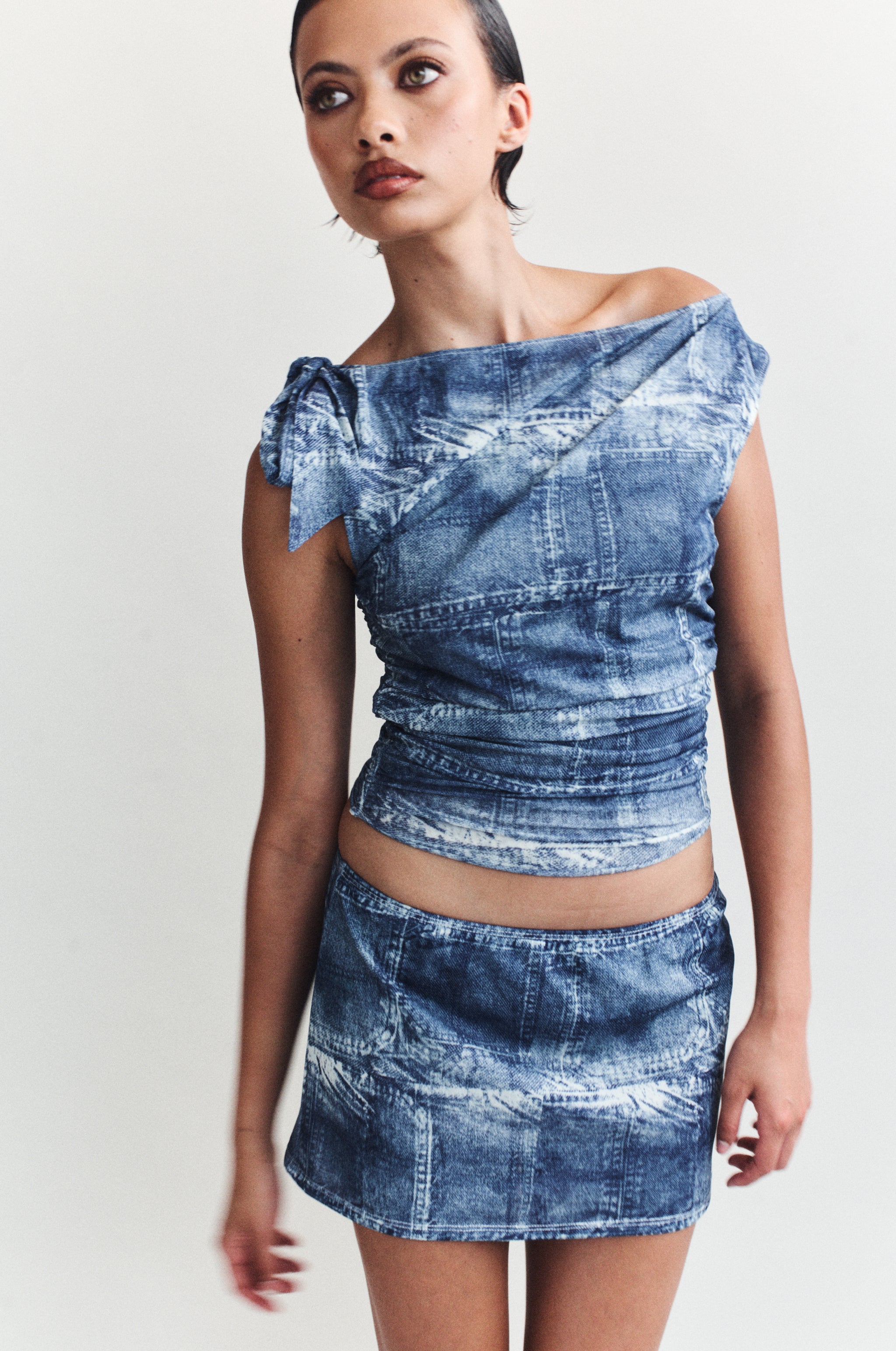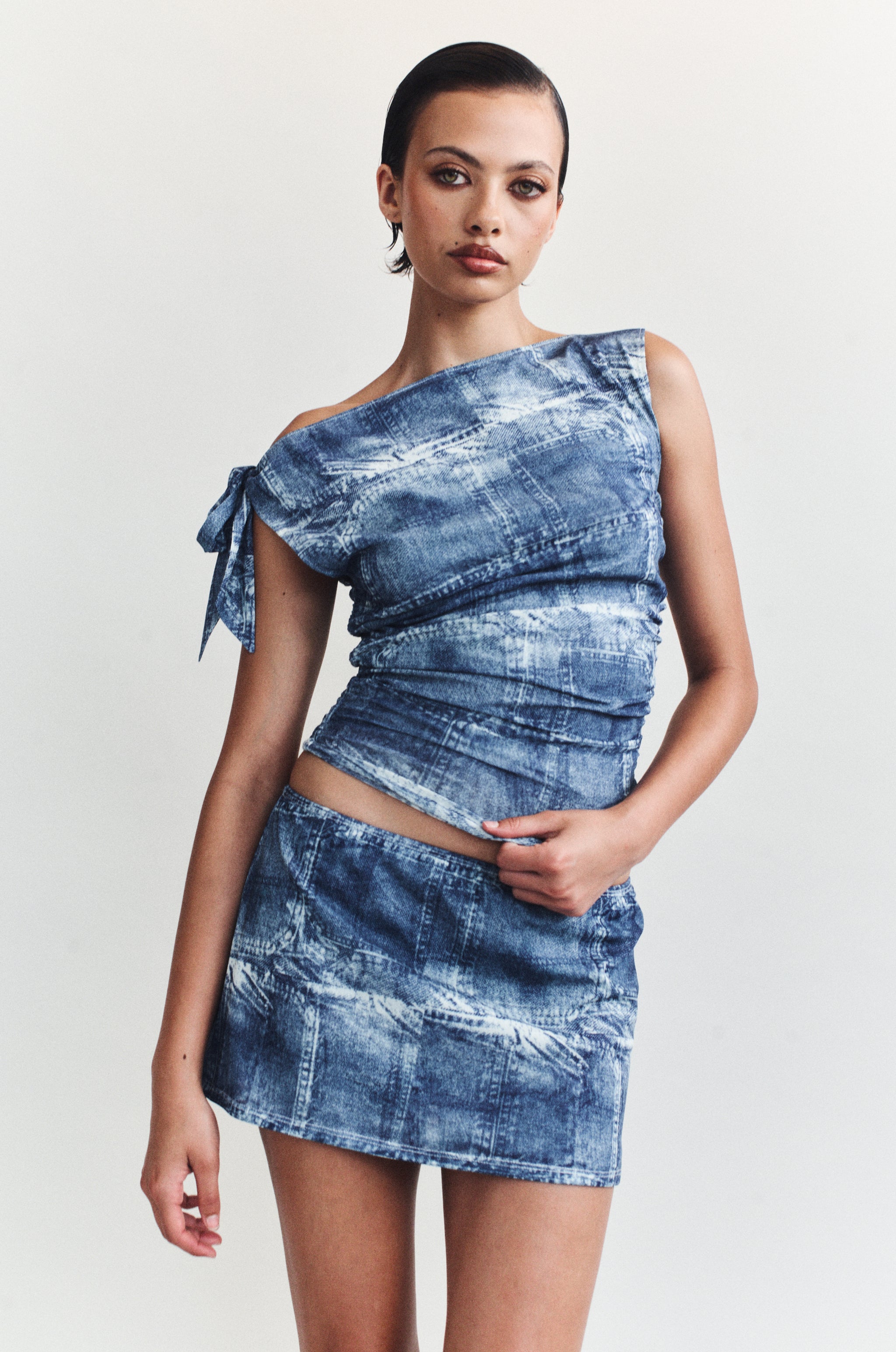 The Siena Skirt is a low rise. mini length skirt designed to be worn low on the hips. featuring a thin elasticated waistband.